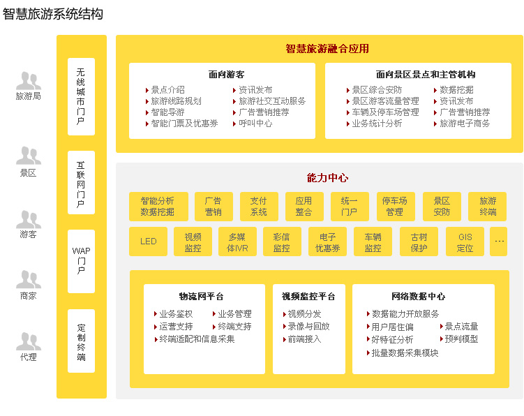 智慧旅游o是通过“三网”融合的方式,把传统景区快速提升到不但支持传统的纸质票销售与管理,同时还支持电子商务、B2B+B2C的电子票平台、移动营销、微信营销、微信卖票、景区智能导览、分享到朋友圈、大数据分析、代理管理等完整且系统化的智慧景区,有了此系统后,您可以快速实现在淘宝、天猫等电商卖电子票,拥有景区的形象宣传网站、B2B+B2C的电子票平台,拥有微信售票、微营销、移动营销、景区导览、分享到朋友圈等移动互联网下的所有功能。