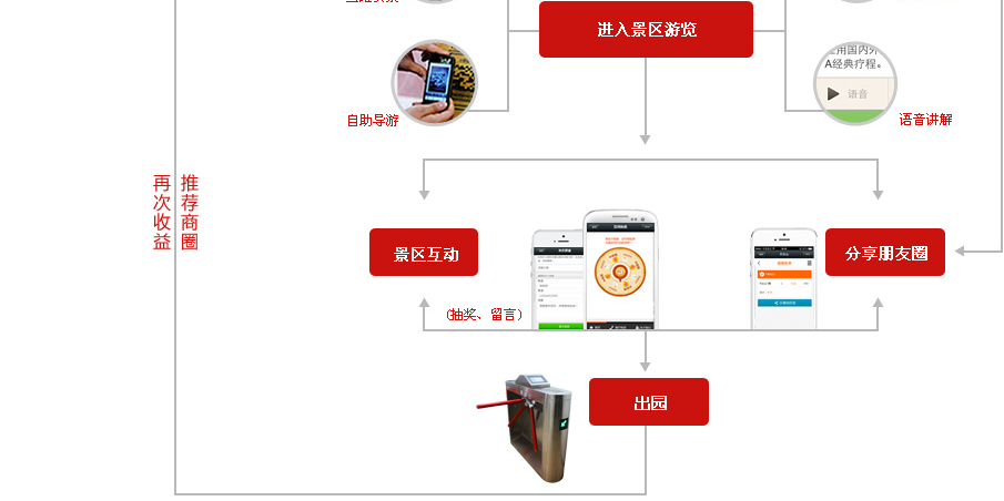 移动营销+微营销+景区导览,通过吸引用户主动扫码(或关注)的方式,使景区宣传更加立体,游客亦可全方位了解景区,包含产品管理,景点介绍,景区导览,景区线路等景区里的吃、游、玩完整介绍,另通过抽奖、大转盘、问卷调查等互动方式,吸引游客提交手机号码获取优惠券,实现商家的二次营销,收取意向用户号码,市场分析等,最为重要的是,商户可做大数据统计,统计不同渠道的广告效果,用户行为分析等完整解决营销类瓶颈问题,如推荐景区周边的吃住购等项目给到游客,形成旅游消费的完整闭环。